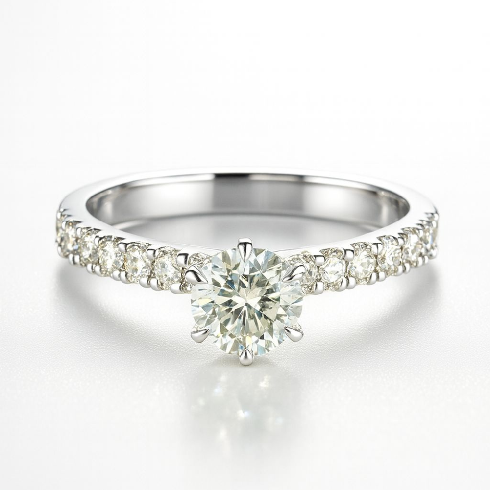 Anel de Ouro Branco 18K (750) com Diamante Redondo 5,2 mm (55 pts) e 30 pts de Brilhantes