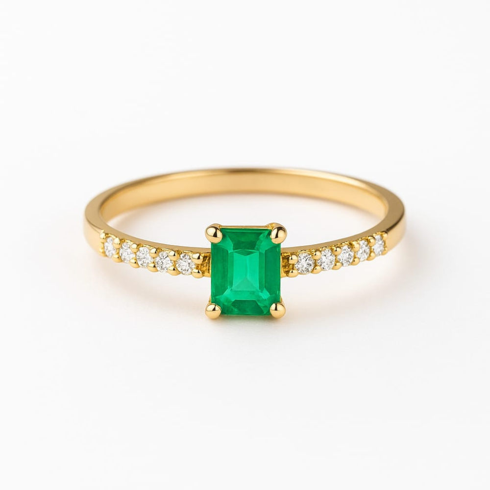 Anel de Ouro 18K (750) com Esmeralda Retangular 7×6 mm e 18 pts de Brilhantes