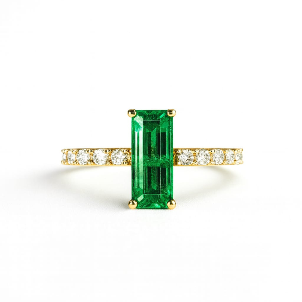 Anel de Ouro 18K (750) com Esmeralda Retangular 10×4 mm e 30 pts de Diamantes