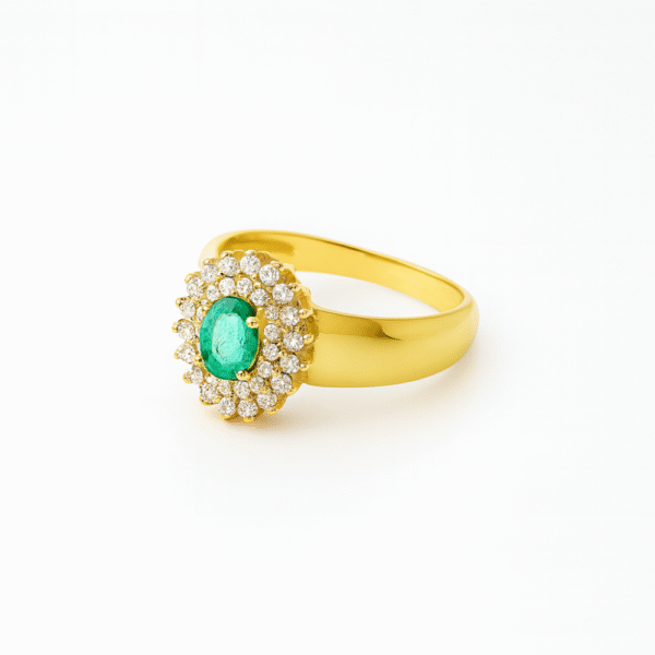 Este anel em Ouro 18K (750) é adornado por uma elegante esmeralda natural lapidação oval 6×4 mm, cuja cor verde intensa simboliza renovação e harmonia.