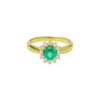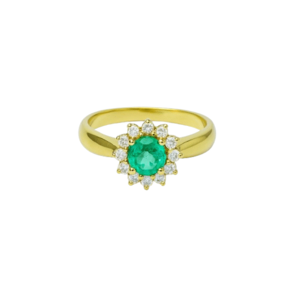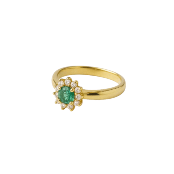Este anel em Ouro 18K (750) apresenta uma esmeralda natural lapidação redonda de 4 mm, com coloração verde vibrante e brilho intenso. A pedra central é realçada por 12 pontos de brilhantes naturais, que criam um halo sutil de luz e tornam a peça ainda mais sofisticada e equilibrada.